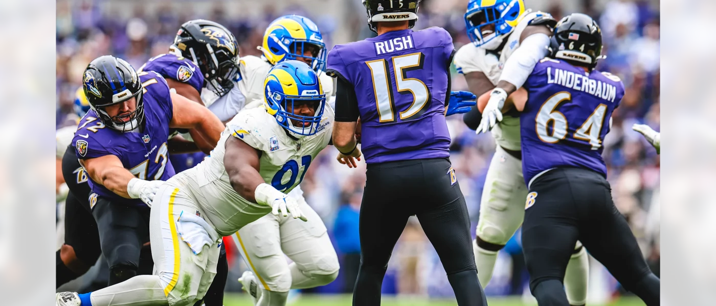 Acht Plays, in denen Pass und Run fein säuberlich aufgeteilt wurden, reichten um von der eigenen 35 an die 8 der Ravens zu kommen. Wohlgemerkt: ohne Puka Nacua anzuwerfen! Wieder einmal sorgten zwei ungenau geworfene Pässe auf Adams in der Redzone dafür, dass die Kicking-Unit einen frühen ersten Einsatz bekam. Joshua Karty hatte auf ein Field Goal allerdings wenig Lust. Stattdessen wurde die aus seiner Sicht rechte Torstange ordentlich auf Haltbarkeit geprüft. DOING! Es blieb beim 3:0.