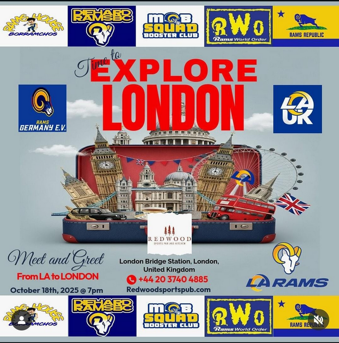 Euer Termin in London am Samstag ist der Redwood Sportspub in der Nähe von der London Bridge. (https://maps.app.goo.gl/5akeyuXHrcwFqRrf9) Mit der Jubilee sowie der Northern Line habt ihr 2 Verbindungen, die an der U-Bahn-Station "London Bridge Station" direkt halten. Von dort sind es nur ein paar Meter zu dem Pub. Dort treffen sich alle möglichen Rams-Fanclubs für einen gemütlichen Pregame Abend mit leckeren Kaltgetränken. Beginn ist um 19 Uhr.